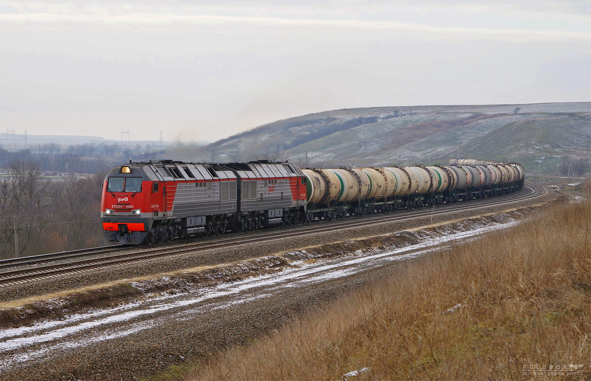 Тепловоз 2ТЭ25КМ-0024 с грузовым поездом, перегон Юровский-Красная Стрела
