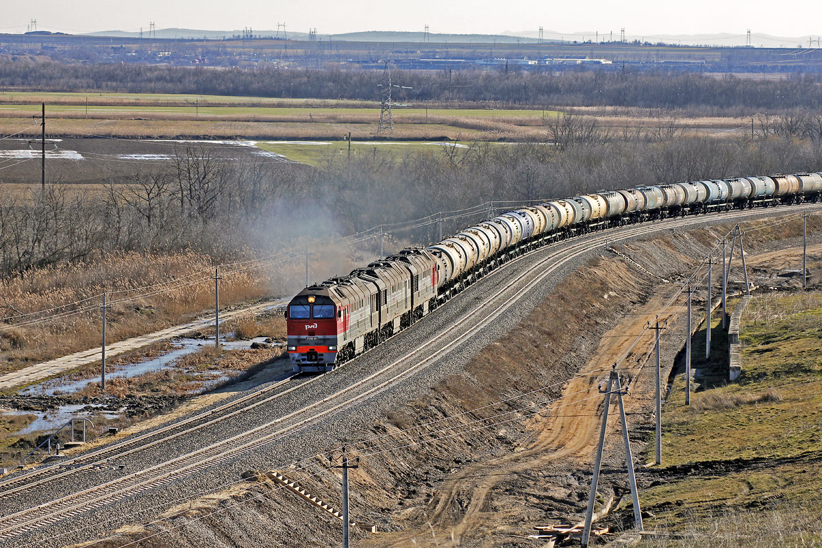 Тепловозы 2ТЭ25КМ-0016 и 2ТЭ25КМ-0096 с грузовым поездом следуют по неправильному пути перегона Красная Стрела-Юровский