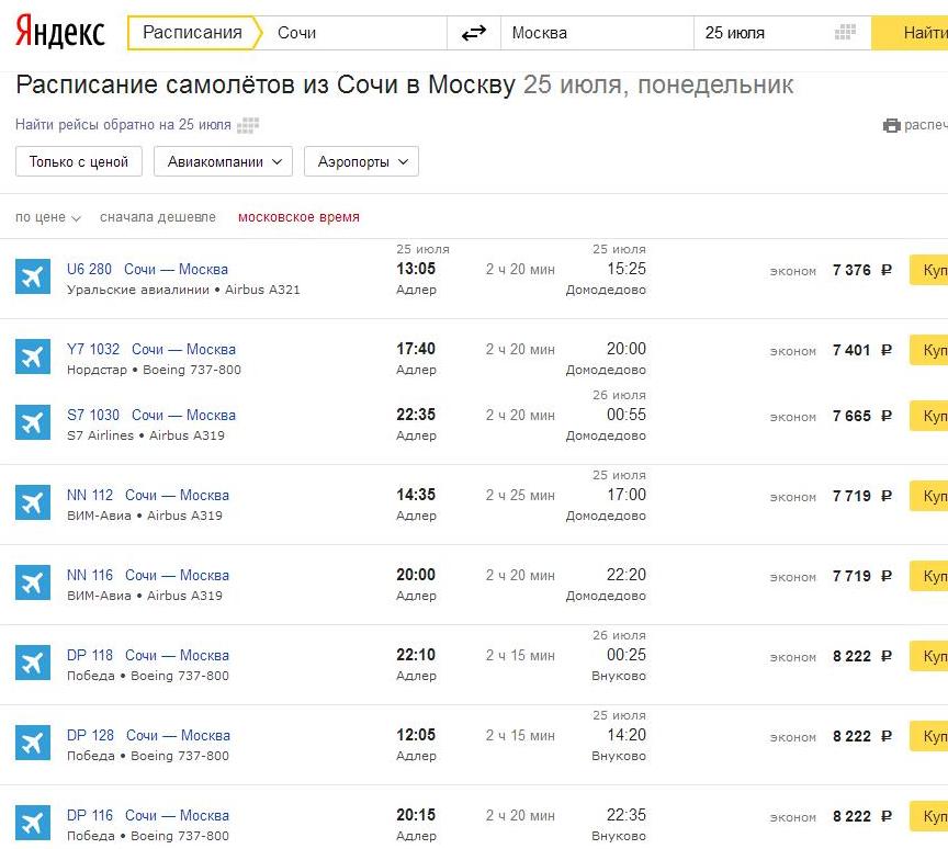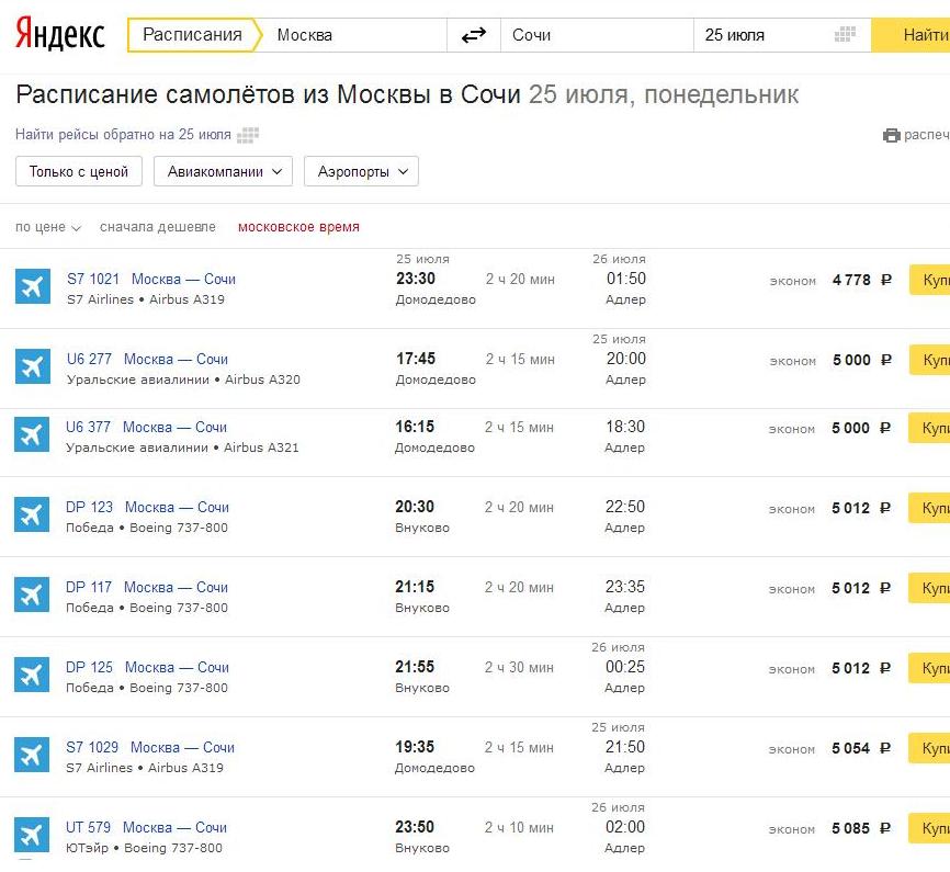 Вот несколько примеров для начала (окончания) отдыха 25.07.2016 в Сочи.