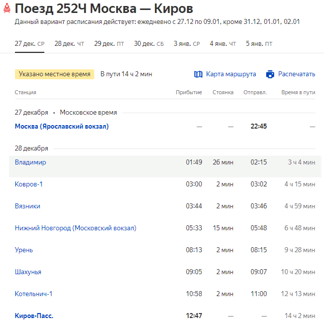 Назначается дополнительный поезд № 251/252 Киров-Москва, отправлением из Кирова с 26 декабря по 8 января ежедневно, кроме 30,31/12 и 1/1; отправлением из Москвы - с 27 декабря по 9 января ежедневно, кроме 31/12 и 1,2/1: