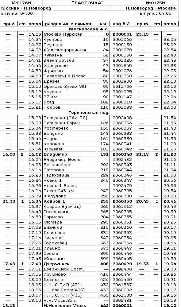 Если можно выложите полный график поезда №175/176 Москва-Нижний Новгород "Ласточка"