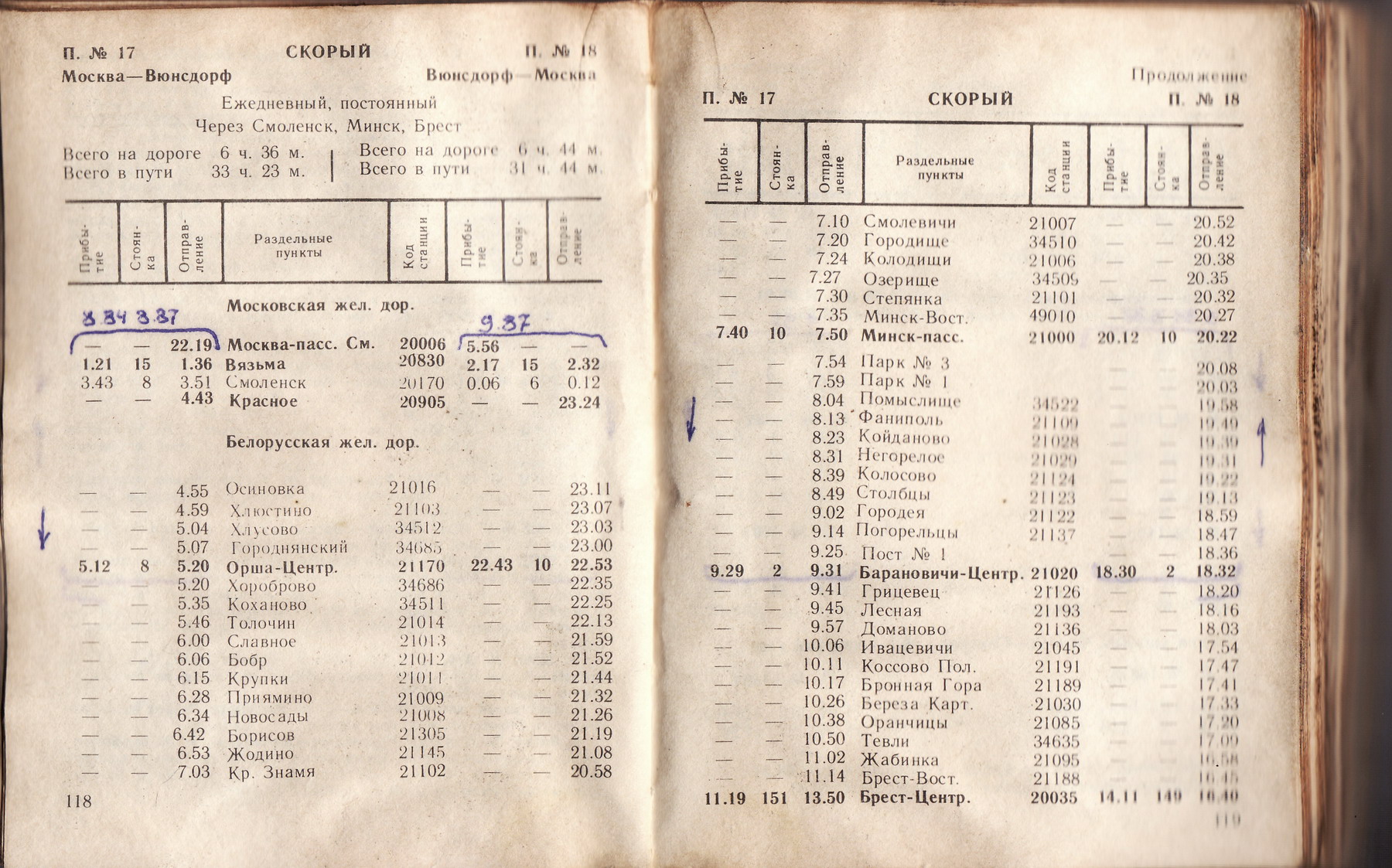 SM@TRON: Подробное расписание поезда № 17-18 «Москва – Вюнсдорф» из служебки БЕЛ ЖД за 1990-1991 годы: