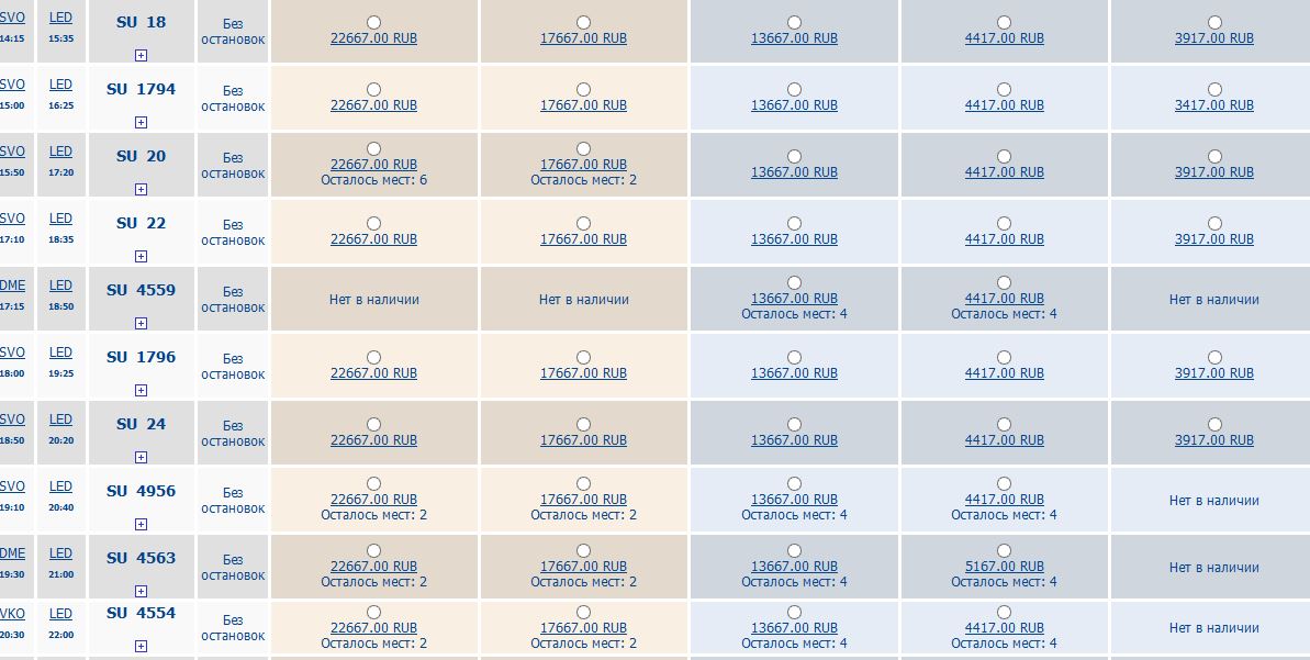 Кстати, по поводу конкуренции "Сапсана" и самолетов. Вот на день-вечер 31 декабря раскуплены почти все "Сапсаны" из Москвы в Петербург. При этом на самолеты в приличную авиакомпанию по относительно конкурентноспособной цене мест еще полно. Вот скрин с сайта "Аэрофлота" по поводу наличия мест и цен Шереметьево-Пулково на день-вечер 31 декабря.