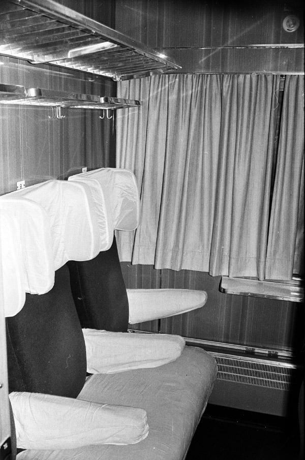 А далее кадры уже современного состояния. Надо отметить, что всё сделано было очень аккуратно, следов махрового "самопала" не обнаруживается. В частности, нет мест крепежа длинного столика, нет мест крепежа крючков в потолке и т.д. Отделка всей боковой стены купе (вокруг окна) изначально из натурального заводского пластика, не подразумевающего вырезы мест под софиты, фиксаторы положения полок, номера мест и проч.