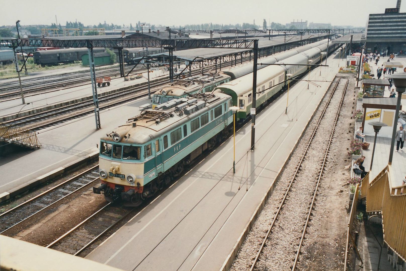 Электровоз MAV V63 037 с поездом № 202 "Agram" сообщением Мишкольц - Загреб и прицепным вагоном SZD Москва - Загреб на станции Балатонфеньвеш, Венгрия (17 сентября 1992 года):
