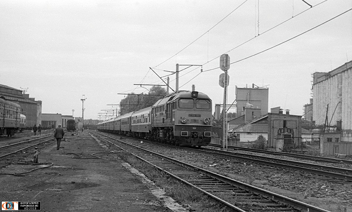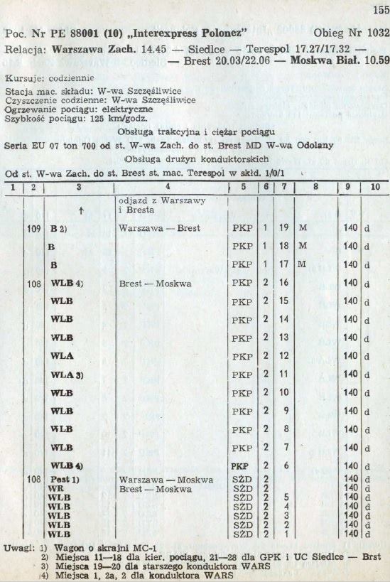 Nie jest to żaden z rozkładowych pociągów bo te o których wspomniałeś były zestawiane z radzieckich wagonów, które miały ryflowane ściany a tu takowych nie widać. W tamtym okresie wagony DR (a taki tu widzimy) kursowały w relacjach Berlin - Brześć ale były to wagon restauracyjny WRm lub WR oraz wagon Ds. Autor foto - Peter Cousins.