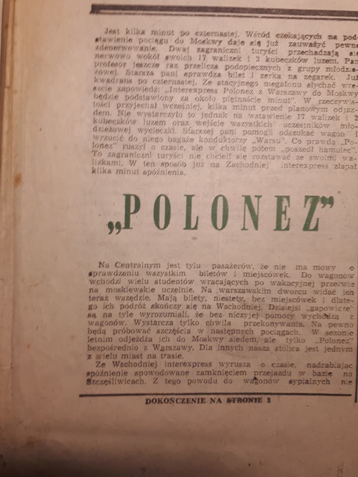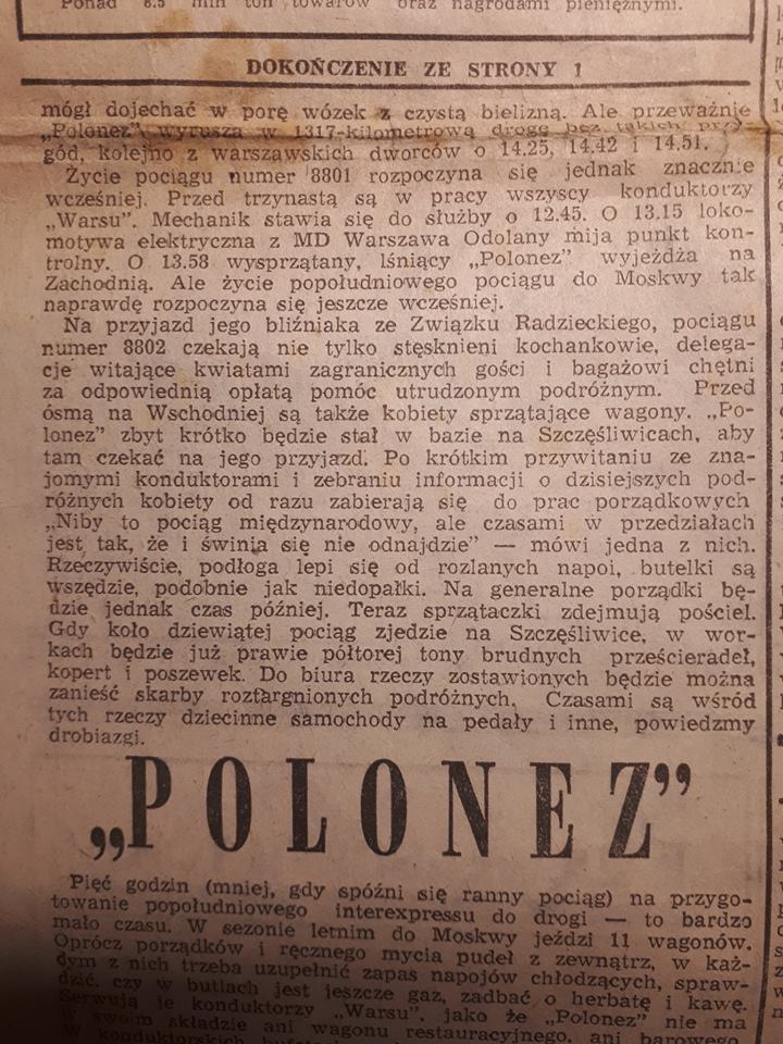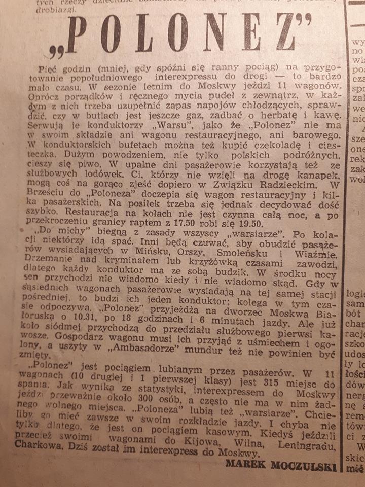 W "Sygnałach" z 4 listopada 1987 roku Pan Marek Moczulski opisuje wrażenia z podróży nocnym "Polonezem" z Warszawy Zachodniej do stacji Moskwa Białoruska. Warto przeczytać, bo krótka relacja zawiera kilka smaczków tamtej epoki.