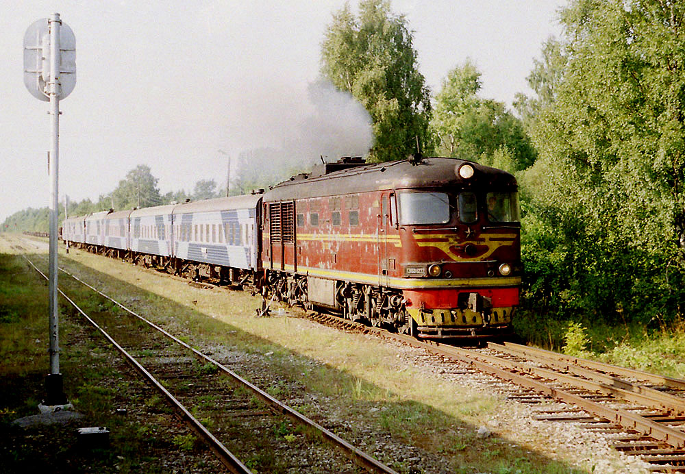 Тепловоз ТЭП60-0222 с пассажирским поездом Таллинн - Вильянди на станции Лелле, Эстония (02.09.1996):