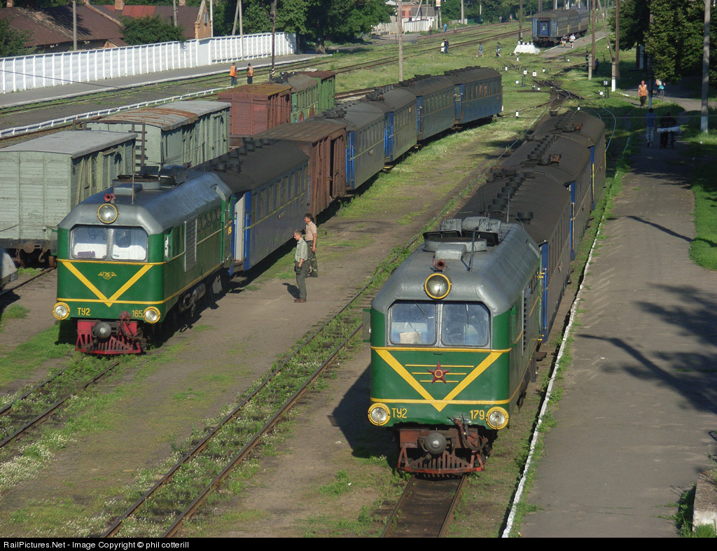 750 mm gauge TU2-179 has arrived at Haivoron from Rudnista while TU2-165 prepares to take just 1 carriage on the 0800 to Golovanesk. The far tracks are 5 feet gauge. Haivoron, Ukraine (June 28, 2006).