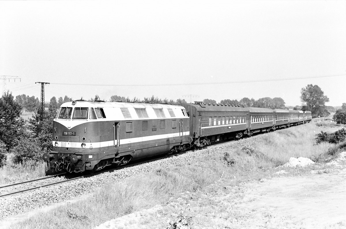 1986 gab es auf der Strecke von Schwerin nach Plate und zurück ein sehr interessantes Zugpaar. Wegen Platzmangel in Schwerin wurde der Zug Moskau - Schwerin - Moskau tagsüber in Plate abgestellt. Dieser Zug verkehrte damals ausschließlich für Angehörige der sowjetischen Streitkräfte. Am 19.06.1986 bringt 118 117-1 vom Bw Schwerin den Zug von Plate nach Schwerin.