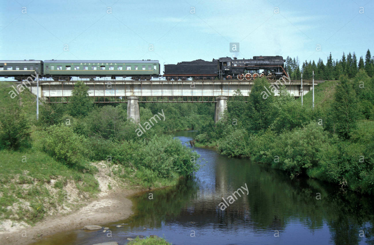 Eine russische LV Klasse, 2-10-2 kreuzt ein Fluss mit einem besonderen Personenzug. Juli 1992.