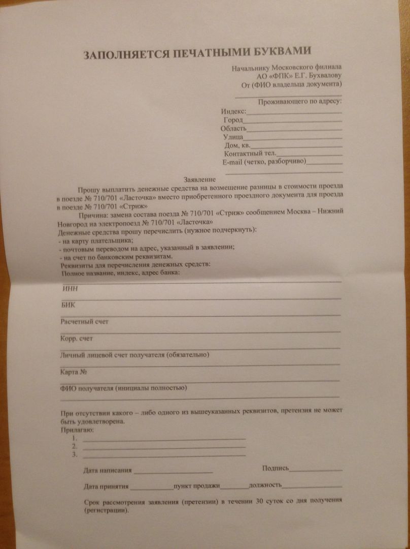 их было предложено заполнить и отдать проводникам. При этом проводники принимали только полностью заполненные заявления. Соответственно, в моем вагоне полностью из заполнить не смог по причине отсутствия полных реквизитов платежа. Указывать вариант выплаты через почтовый перевод тоже никто не стал, так как было сказано, что в этом случае будут удержаны почтовые расходы. Хотя, на мой взгляд, достаточно номера банковской карты, а по большому счёту - номер электронного билета, если он приобретался через сайт РЖД.