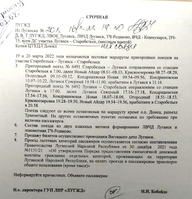 ГУП ЛНР «Луганская железная дорога» сообщает, что с 12 часов 00 мин 21.03.2022г. до особого распоряжения назначаются пригородные поезда на участке Старобельск - Луганск - Старобельск