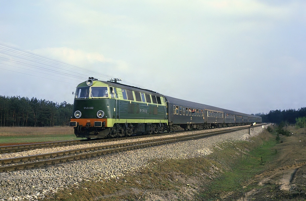 Тепловоз PKP SP45-232 с поездом № 3110 "Солина" сообщением Загуж - Нижанковичи - Пшемысль - Люблин - Варшава на станции Рудник Строга, Польша (3 мая 1987 года):