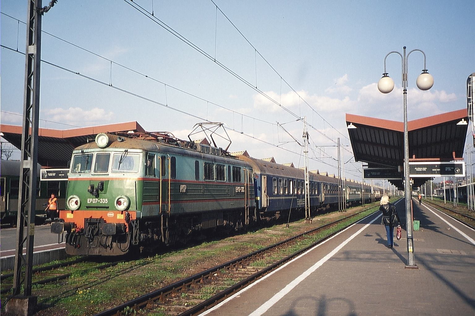 Przemyśl Glowny, April 26th, 2004. It's time to say bye, we had a great time I won't forget... EP 07-335 and D 38202 from the southeast end (Przemyśl) to the nearly northwest end (Szczecin) are ready to depart. We (some members of "Gospelchor Lüneburg") will take it till Kraków.