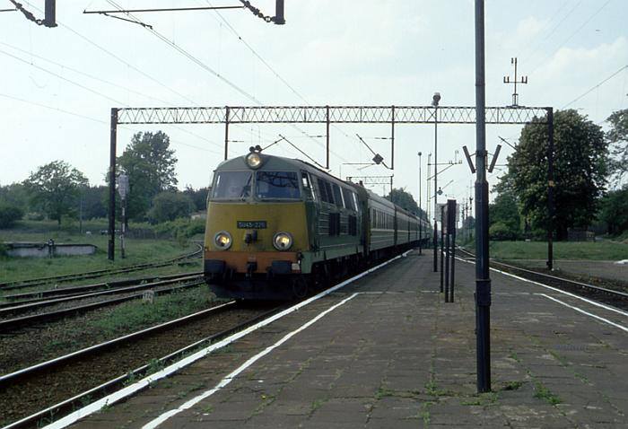 Rzepińska SU45-226 z pociągiem № 247 "Moskwa-Express" relacji Berlin Lichtenberg - Moskwa Białoruska przejeżdża przez Kunowice - pierwszą stację na terytorium Polski. 9 maja 1993 roku.