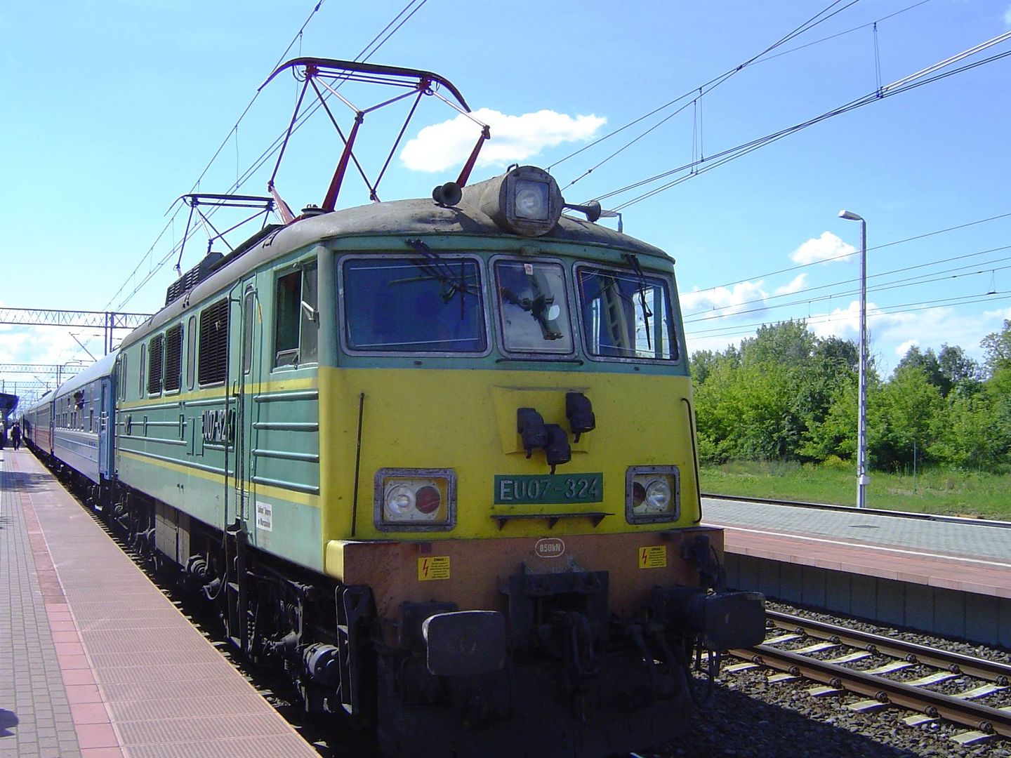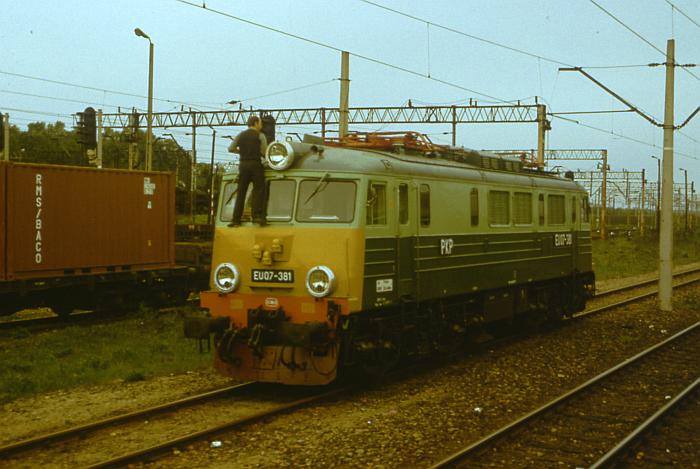 Poznański elektrowóz EU07-381 w Rzepinie. Maszynista lokomotywy aktywnie wypełnia czas oczekiwania na podjęcie kolejnego pociągu. 27 maja 1991 roku.