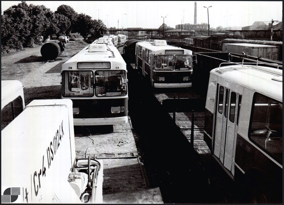 4 lipca 1985 - Słupsk, ul. Towarowa, rampa PKP. Nówki na otwarcie od zaprzyjaźnionego ZSRR. Numery 550-556. Z archiwum MZK, zdjęcie wykonał Pan Ireneusz Wojtkiewicz.