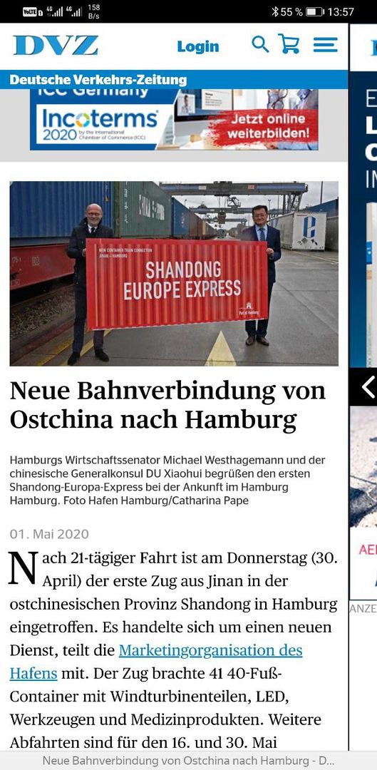 Вчера из китайского города Дачжоу провинции Сычуань отправился первый регулярный контейнерный поезд в немецкий Гамбург. Поезд пересечёт территорию пяти стран: Китая, Казахстана, России, Белоруссии и Польши. Новый сервис составит конкуренцию морскому транспорту за счёт ускоренной доставки китайских товаров в Европу.