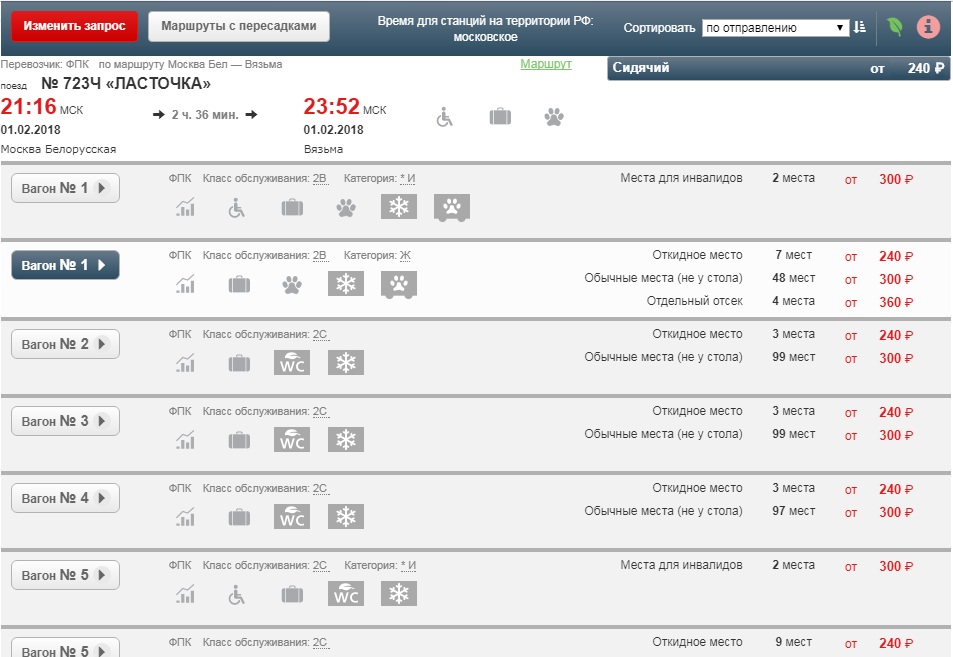 С даты продажи 26 января 2018 г. в вагонах с местами для сидения (класса 2С и 2В) поезда "Ласточка" №721/722 №723/724 сообщением Москва – Вязьма действует акционная цена: от 300/240 руб.