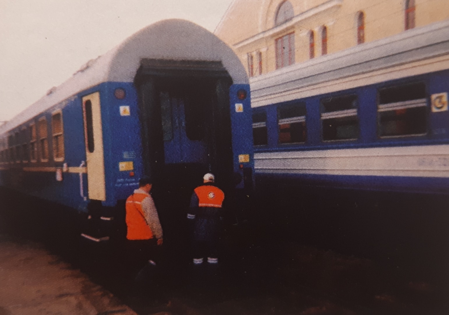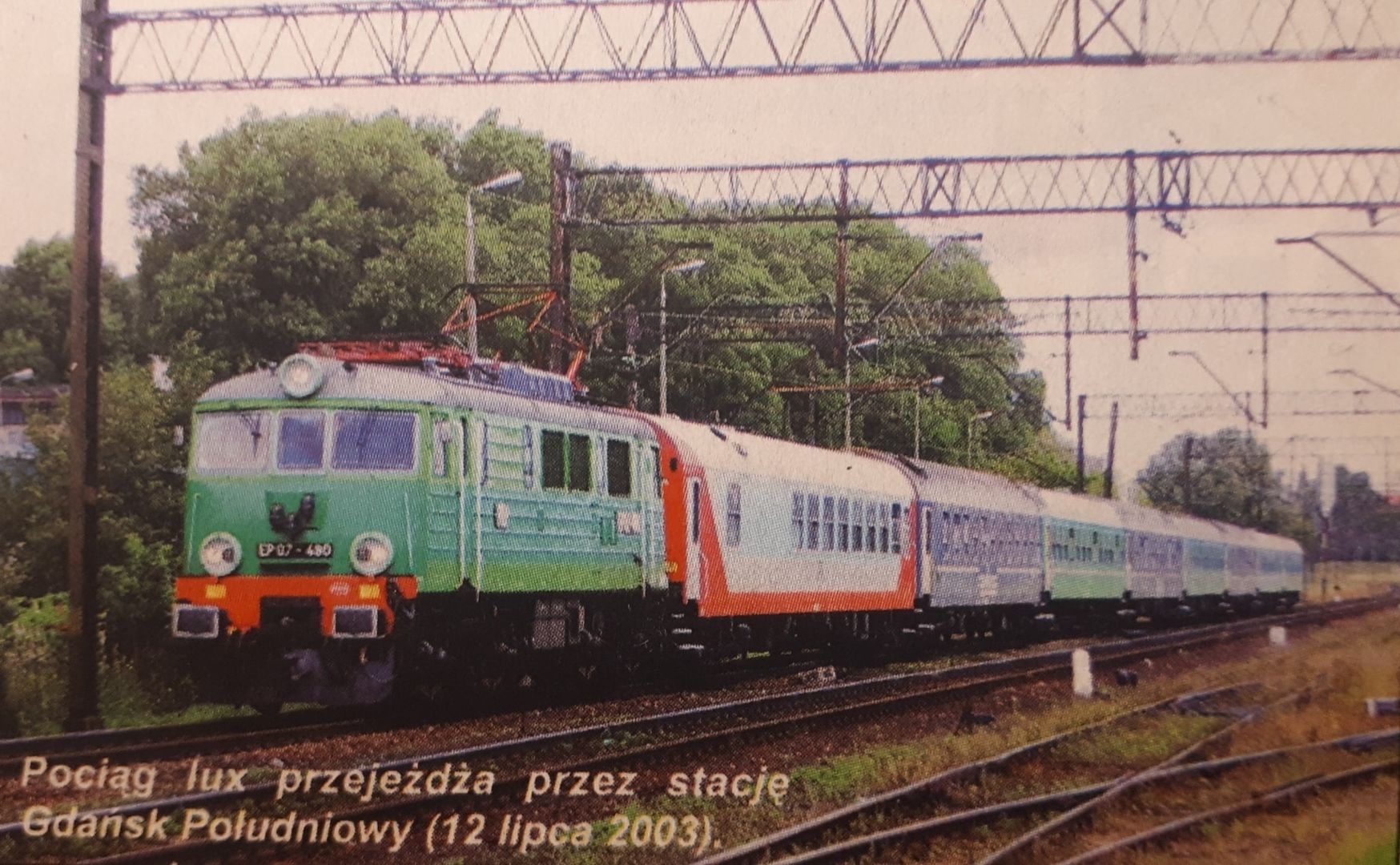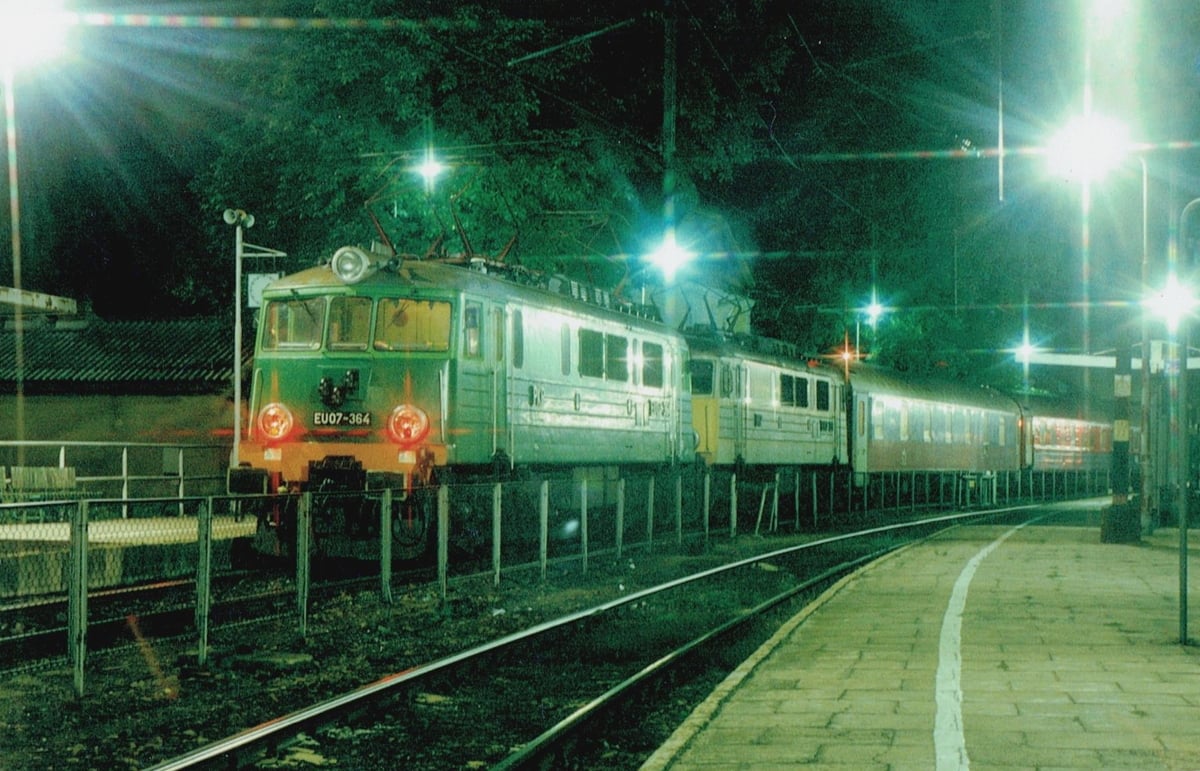 Pociąg "Batory" planowo obsługiwany dwoma EU07, w tym dniu 364 i 323, oczekuje godziny odjazdu. Zaraz za lokomotywami wagon w malowaniu charakterystycznym dla Kolei Rosyjskich RŻD, należący jednak do słowackiego przewoźnika Železničná spoločnosť Slovensko, a.s. Zwardoń, lipiec 2003 roku.