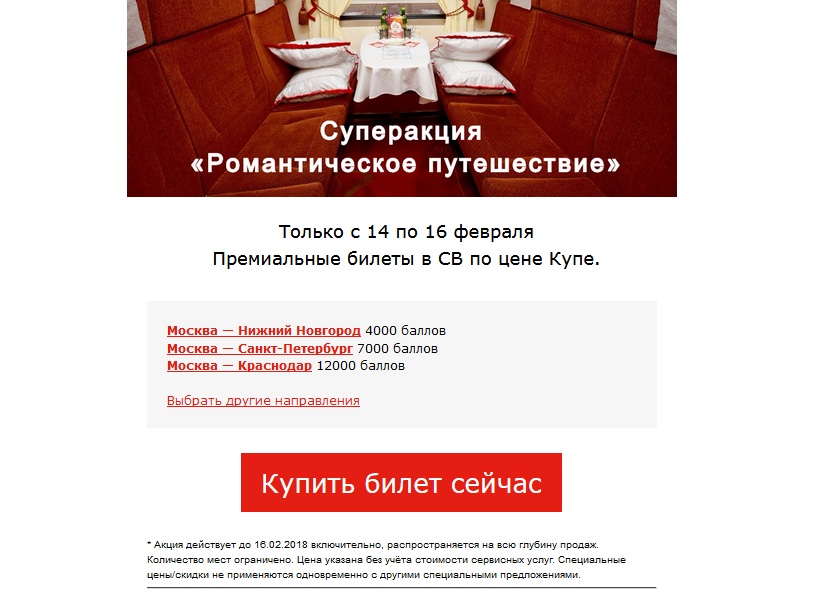 Акция действует на поезда отправлением с 16.02.2018 по 26.04.2018 (кроме 22, 25.02, 07, 11.03.2018).