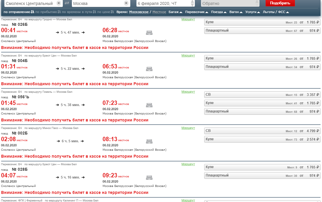 Так стало уже сегодня. И от Орши, например, теперь без проблем можно купить на сайте БЧ на всё, что отправляется оттуда более чем через 65 минут, кроме 008Б на 05.02.SvyatSvyat: Как оказывается, нет. На сегодняшнюю ночь, и на 5 и на 6 так же невозможно купить онлайн билеты Смоленск - Москва на поезда БЧ. Причём не на все, например, на 5 февраля в поезд 8 Брест - Москва можно купить онлайн, а на 4 и 6 нельзя. И на сайте БЧ тоже нельзя купить эти билеты.