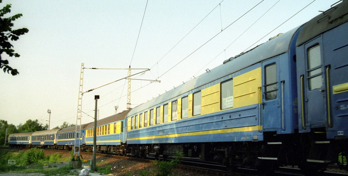 Вот это тоже очень интересная версия "Кафешантана": до Киева всего три вагона, из которых РИЦ КВР Быдгощь (с бело-салатным интерьером) пока только один, остальные - ещё олимпийцы. С 2004 года киевских вагонов станет пять, и они все будут со следами творчества Быдгощи, а эти олимпийцы поедут в "Тисе", в то время как освобождённые оттуда корыта 73/76 года × ДВРЗ со сдвижными дверями купе на время пойдут под забор. А вот ВБС в Харьков и Симферополь до самого последнего поезда ходили на латанных-перелатанных олимпийцах.