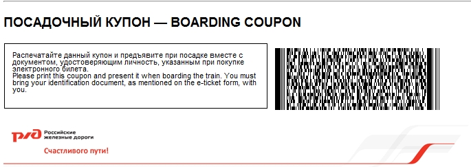 Для посадки в поезд необходимо предъявить проводнику вагона распечатанный посадочный купон на бланке контрольного купона или его изображение на мобильном телефоне, планшете.