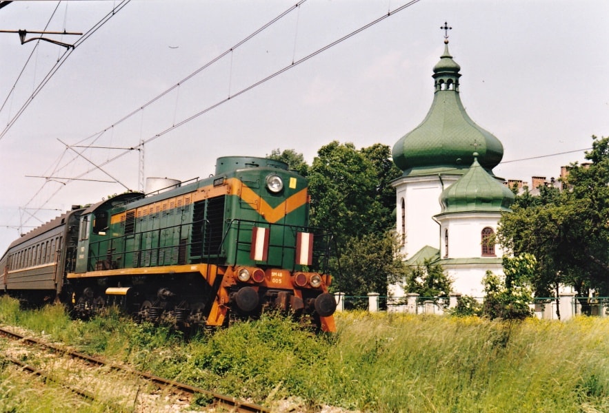 PKP SM48-005 z lokomotywowni w Żurawicy wyjeżdża z Przemyśla z pociągiem do ukraińskich Mościsk. Lato 1994 roku.