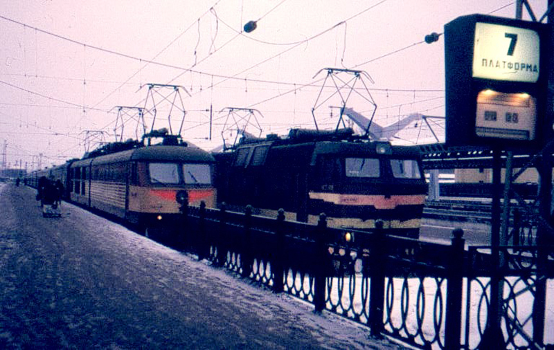 Электропоезд ЭР2-1186, электровозы ЧС2-745 и ЧС2-712 на станции Москва-Пассажирская-Павелецкая, город Москва (фото сделано в декабре 1990 года):