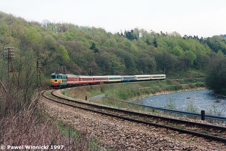 Autor pisze: "W pierwszych latach pociąg traktowany był przez Północną DOKP jako prestiżowy i zestawiano go może nie z najlepszych, ale z naprawdę dobrych wagonów - np. 120A świeżo po naprawach głównych z nowymi wnętrzami i fotelikami obitymi welurem. Oczywiście wagony te szybko zostały zdemolowane przez przemytników i służby celne na granicy, więc po paru miesiącach pociąg wyglądał jakby kursował w kraju od dawna ogarniętym wojną. Później miejsce zmodernizowanych 120A zajęły zwykłe przedziałowe 111A, co trochę poprawiło sytuację, ale ze względu na ogromny przemyt po kilku latach podzielono pociąg na dwa składy kursujące do i od Braniewa, gdzie należało się przesiąść, choć formalnie był to jeden pociąg relacji Gdynia - Kaliningrad - Gdynia. W Braniewie na stacji przejście z jednego pociągu do drugiego odbywało się przez komorę celną, co ukróciło przemyt. Na zdjęciu to właśnie ta łamana wersja, czyli de facto pociąg Kaliningrad - Braniewo ze skomunikowaniem do Gdyni".