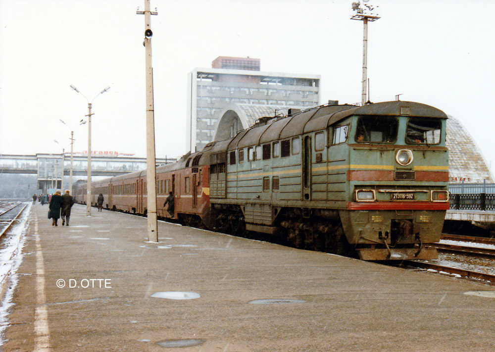 Тепловоз 2ТЭ116-592 и дизель-поезд Д1 на станции Луганск (Lugansk / Luhansk), Луганская область (03.1997):