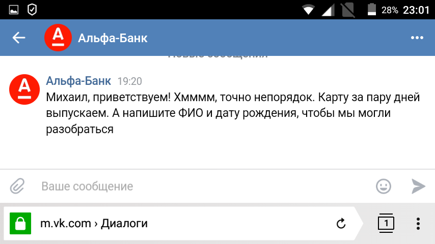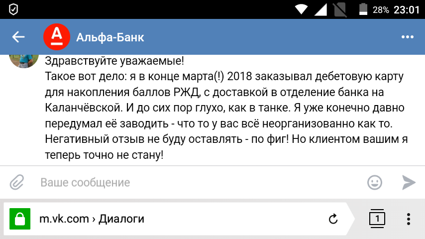 Ну и ради прикола списался с ними в контакте:Железнодорожный: Больше 3-х месяцев (с конца марта) уже прошло с тех пор, как я заказал дебетовую альфовскую карту! Глухо до сих пор. Я конечно давно уже передумал её заводить - ну их нах с таким обслуживанием. Позвонят - туда же их и пошлю. Просто интересно, когда же всё таки соизволят сообщить о готовности карты?