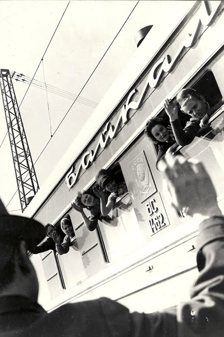 "Druzhba" Moscow – Tbilisi, red-yellow color scheme, Skoda engine ChS2, Moskva in July 1966 (Dr. Fritz Stoeckl)