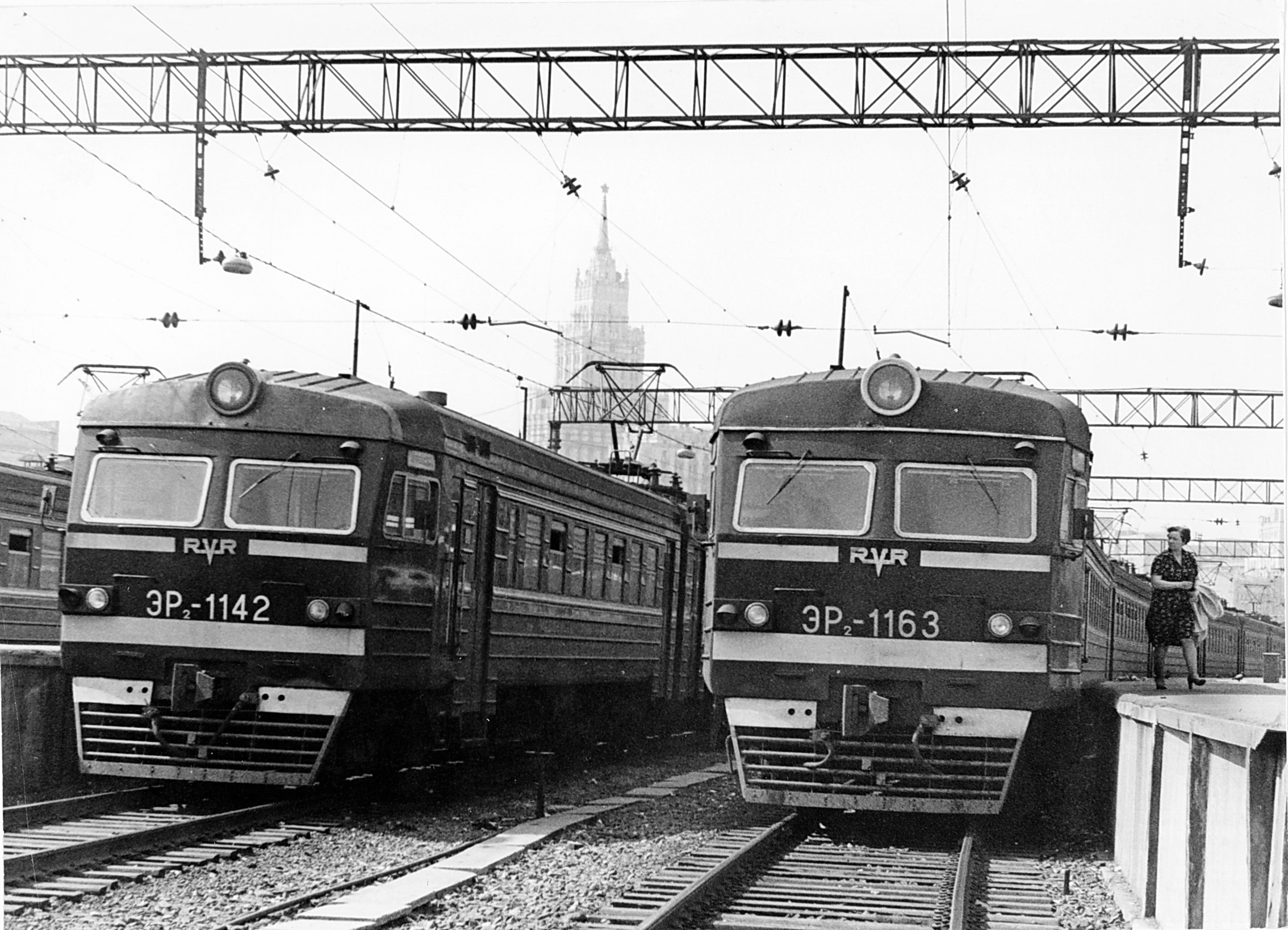 Электропоезда ЭР2-1142 и ЭР2-1163 приписки депо Раменское на перроне Казанского вокзала г. Москвы.