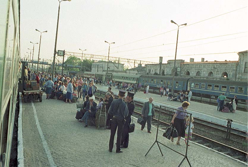 Pasażerowie i pociąg międzynarodowy na stacji w Białymstoku, 14.05.1993. Foto J. Szeliga