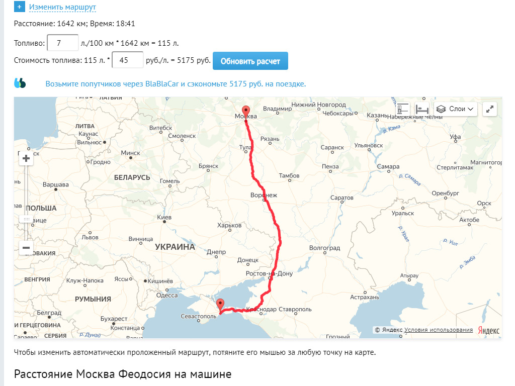 Вот примерный расчет на маршрут МСК-Феодосия 5100 примерно в один конец + платная дорога 1600 без транспондера + заправка в Крыму например 1 раз ну тоже 1500 итого из МСК туда обратно выйдет 18000 т.р. А тут начальная точка южнее, то так примерно и будет 15 т. Ну конечно если у вас гоночный болид который по трассе с климатом потребляет все 20 литров то да расчет будет немного другой )))