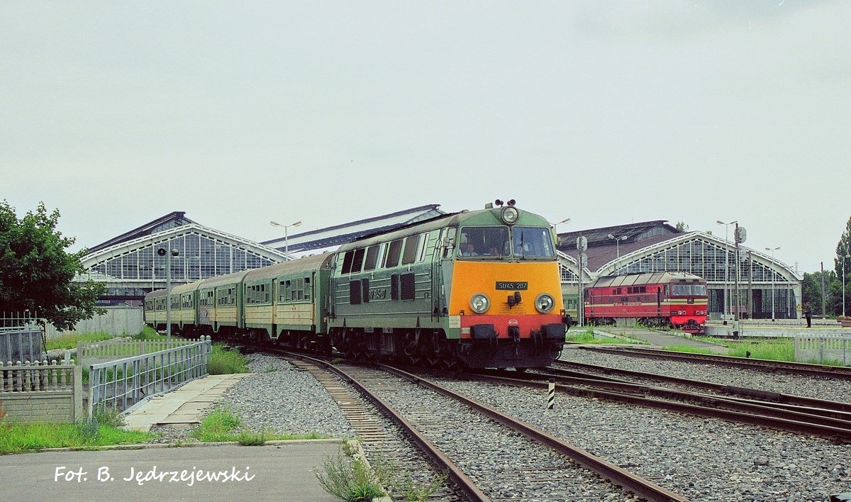 Na zdjęciu i z opisu Pana Bohdana: 22 lipca 2000 roku na stacji Kaliningrad Jużnyj (Południowy): Malborska lokomotywa SU45-207 opuszcza najokazalszą stację Kaliningradu z pociągiem pospiesznym nr 7 do Gdyni (Braniewa). Skład w całości zestawiono z mocno wyeksploatowanych wagonów typu 102A. Na drugim planie do odjazdu przygotowuje się TEP70-0391 z pociągiem pospiesznym nr 150 "Djuny" (pol. "Wydmy") do Moskwy Białoruskiej.