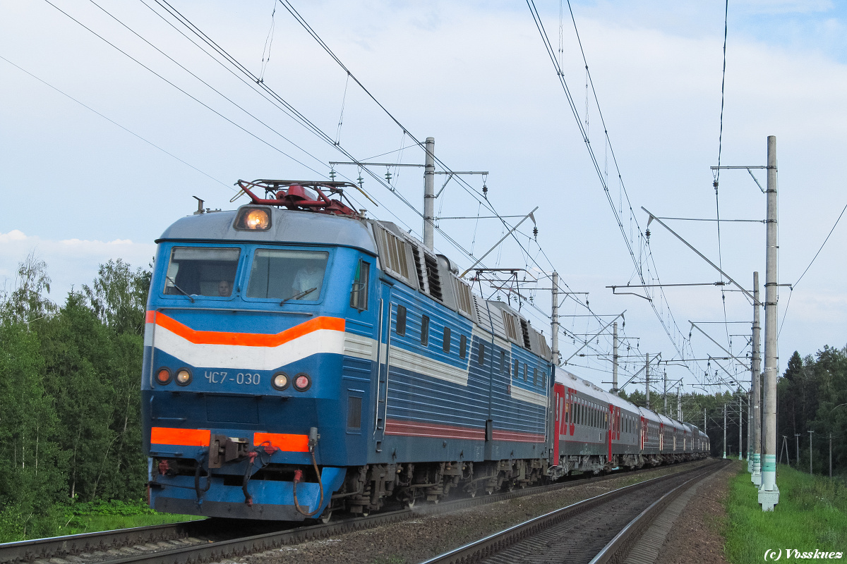 Электровоз ЧС7-030 со спецпоездом № 409 "ЕВРО-2012" Москва — Варшава на перегоне Кубинка-I — Тучково, Московская область (15 июня 2012 года):