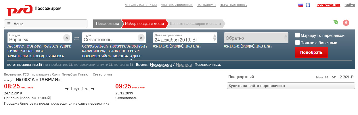 Сайт РЖД показывает отправление только 23.10, а завтра, увидим на 24.10 и Воронеж, и Ростов .nataly-m:Сайт прекрасно реагирует и на запрос "Воронеж" (показывая поезда как от/до Воронеж1, так и Придачу).Shtirlits:Он через Воронеж не идет., см.Придачу.