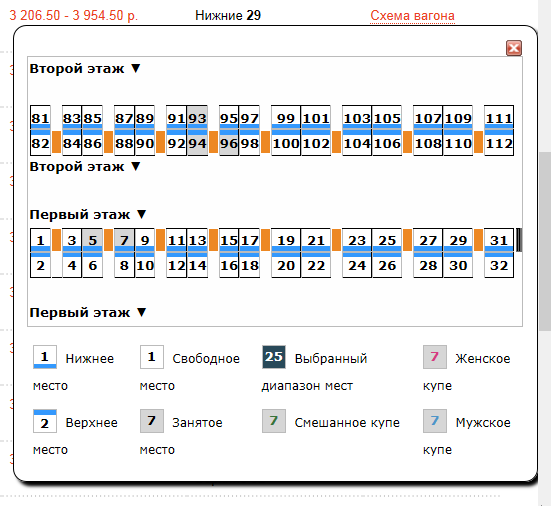 Присобачили на тикете схему двухэтажников, но очень она неудачная вышла, я так понимаю, оранж прямоугольники - это окна, но выглядят как разделители купе.