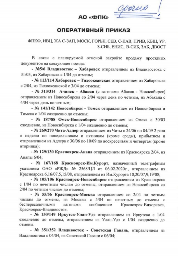 Да они там с дубу рухнули. Оставить без пассажирского сообщения весь Восточный БАМ и линию на Совгавань, а также ветку Известковая-Чегдомын. И как вишенка на торте - отменить "Океан".Chesnok007: Приказ об отменах вышеперечисленных отозвали. Интересно, что из этого фейк