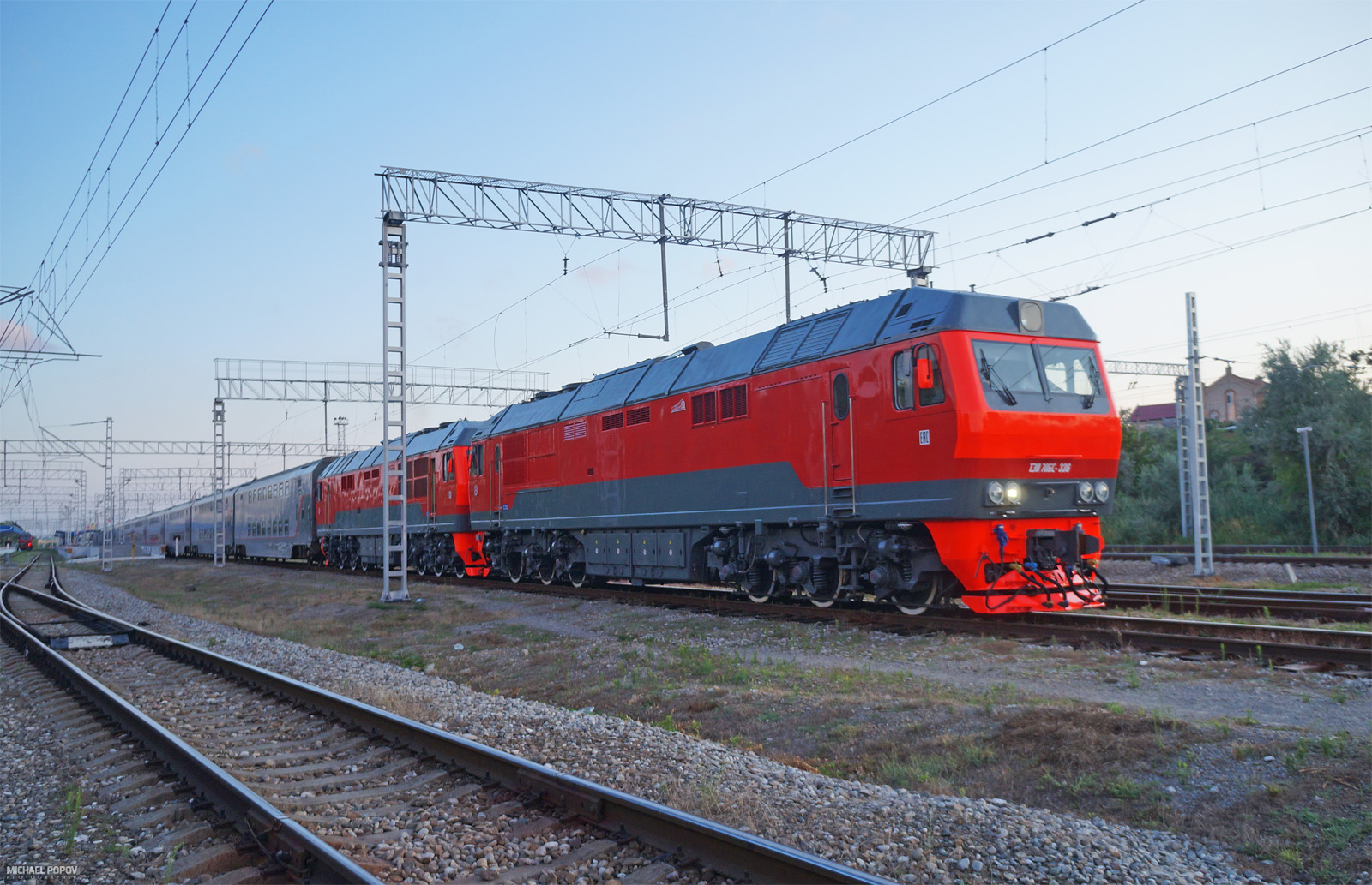 Тепловозы ТЭП70БС в серо-красно-оранжевой ливрее на Анапских жд. просторах. Июль 2019 г.