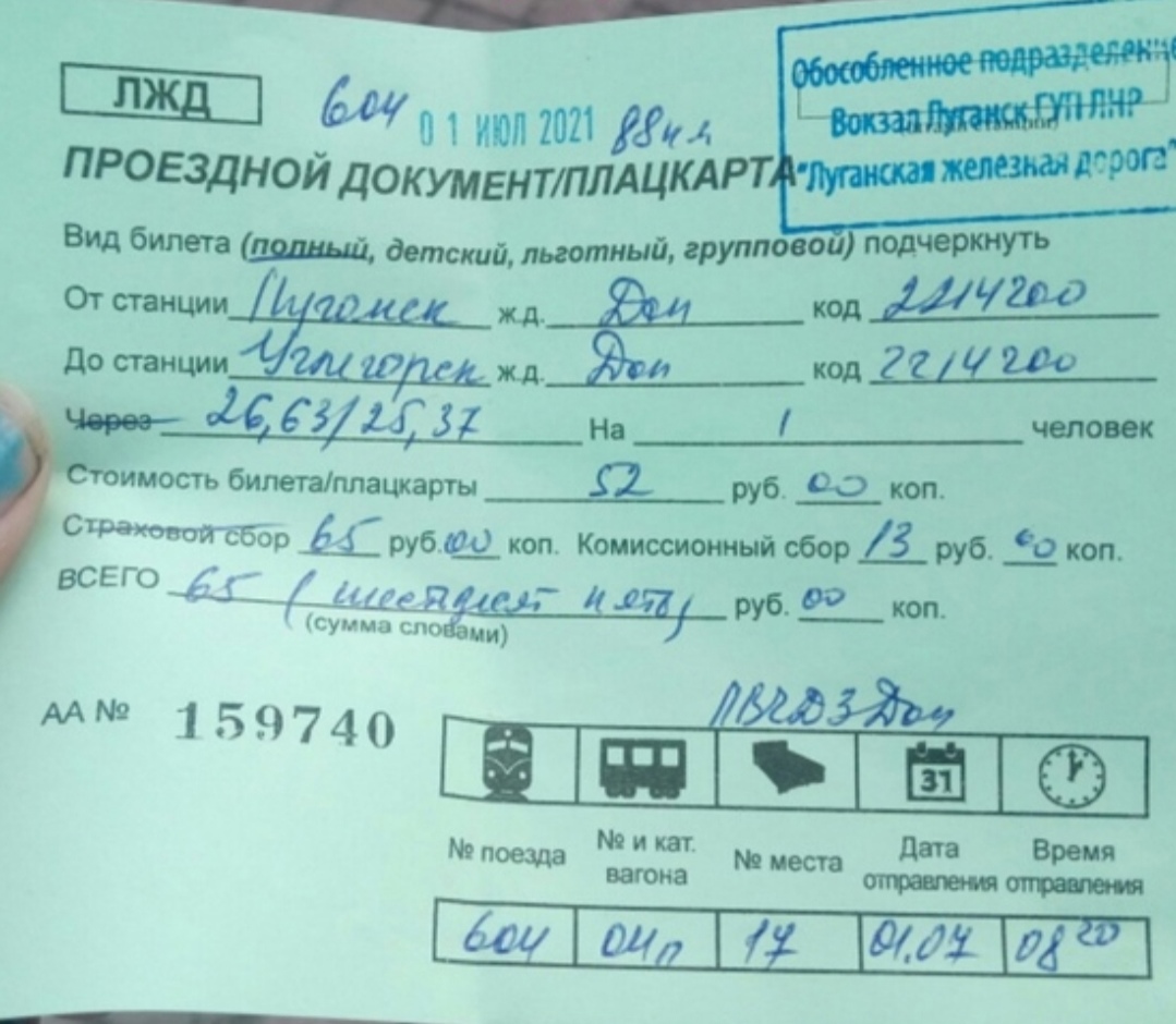 Цены вообще смешные. Плацкарт Луганск-Углегорск 52р и комсбор 13р. Итого 65р