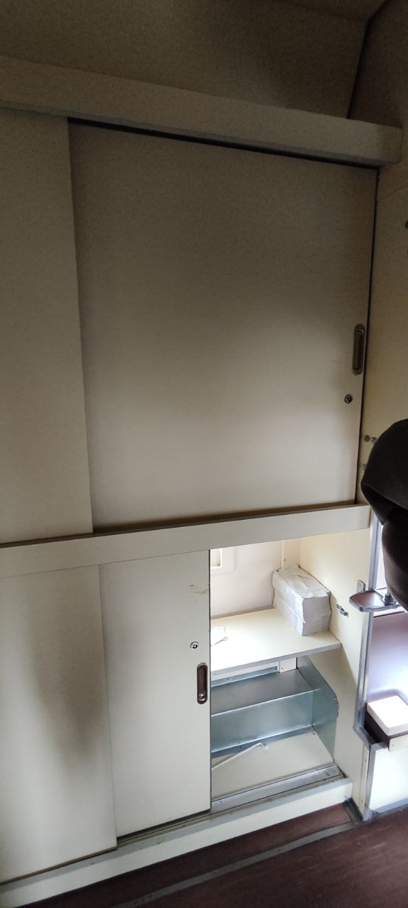 Но вот белья в этих шкафах никакого не было (когда выносила мусор, видела как проводница его отпирала - убирала дезсредство и доставала туалетную бумагу). Шкаф вообще полупустой.