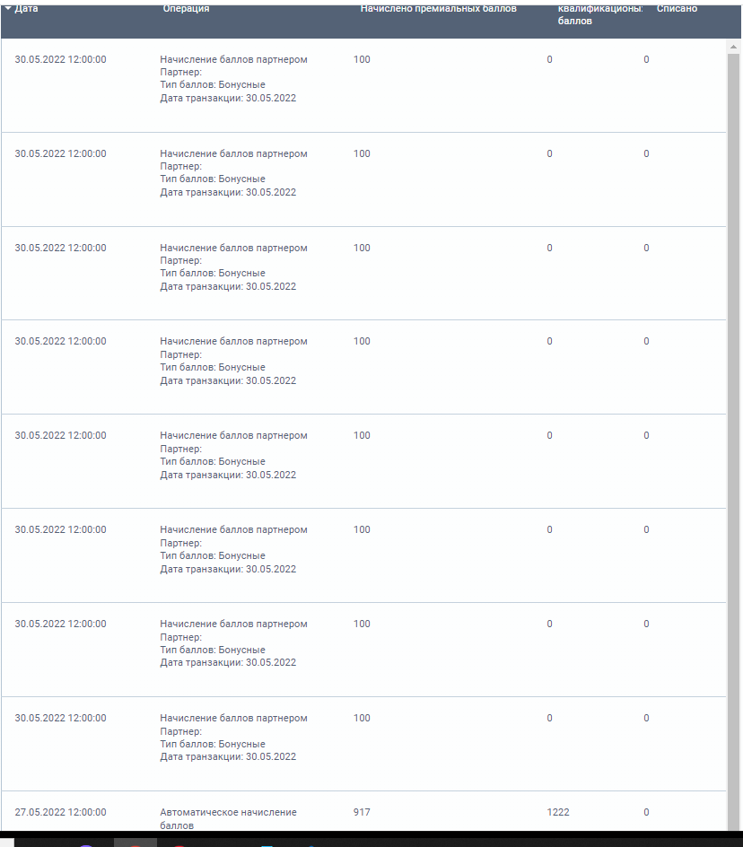 Сообщаю, что все начисления наконец отобразили задним числом одной и той же секундой 12:00:00 той же даты.Serge&: 30 мая ровно в 12 часов партнёром добавлено сто бонусных баллов.