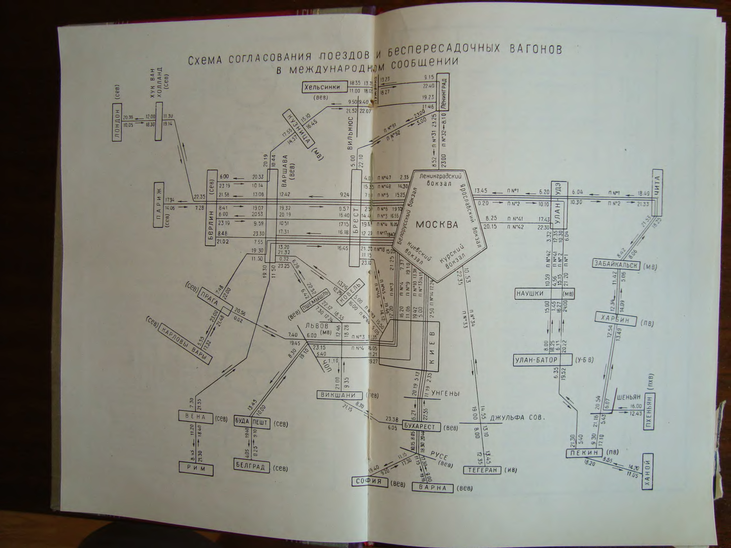 Кстати, из сетевого за 61-й год можно почерпнуть довольно много интересного. Например то что полноценные пункты перестановки вагонов на западных границах тогда были только в Бресте и как ни странно - в Пшемысле и Вадул-Сирете (поезд №№ 25/26 Варшава - Львов - Бухарест запустили транзитом через СССР как раз после появления пунктов перестановки на польской и румынской границах). В Кузнице перестановки ещё не было, равно как и в Унгенах. И понятное дело перестановкой в Ягодине даже и не пахло (поезд №№ 83/84 Киев - Ковель - Варшава явно был пересадочным по Ковелю или Дорохуску). А строящаяся перестановка в Чопе, судя по всему, могла переваривать всего около десятка ВБСов в сутки. А вот в Китай поезда уже шли без пересадки - это значит что в Эрляни и Забайкальске перестановки уже вполне себе работали. Прямые поезда №№ 3/4 и 5/6 Москва - Берлин уже есть а вот прямого поезда №№ 17/18 Москва - Вюнсдорф ещё нет (в 65-м году он уже будет а в 61-м году он ходит только до Берлина). Прямого поезда в Хельсинки ес-но тоже ещё нет, зато есть те самые прицепные вагоны которые шли через Ленинград каким-то мега-кривым маршрутом. Ну и так далее...