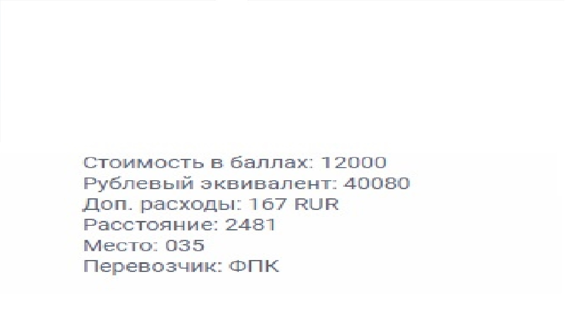 Покупали премиальный билет Минск-Москва на поезд ФПК через приложение. В баллах 4000, после ввода данных ошибка,не понравилась эл.почта. Стали покупать через новый сайт. Тот же поезд,маршрут,вагон и место,а сумму в бонусах уже 7000. Вот такой косяк. Повторно через приложение купили за 4000 бонусов.