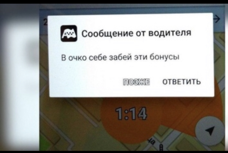 v_gildenberg: Один раз я попытался оплатить поездку на такси бонусами :8-): Вот такой вот мне пришёл ответ от водителя